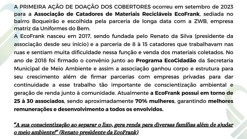 O valor comercial da matéria prima advinda de resíduos têxteis é 100% revertido em cobertores corta-febre, dos quais iremos comercializar 80% e doaremos 20% para instituições cadastradas em nossos projetos sociais. Os demais resíduos (EPIs) não utilizados nesse processo (com valor comercial), são destinados a ASSOCIAÇÃO DE CATADORES DE MATERIAIS DESCARTÁVEIS ECO FRANK, auxiliando na geração de renda dos trabalhadores cooperados.